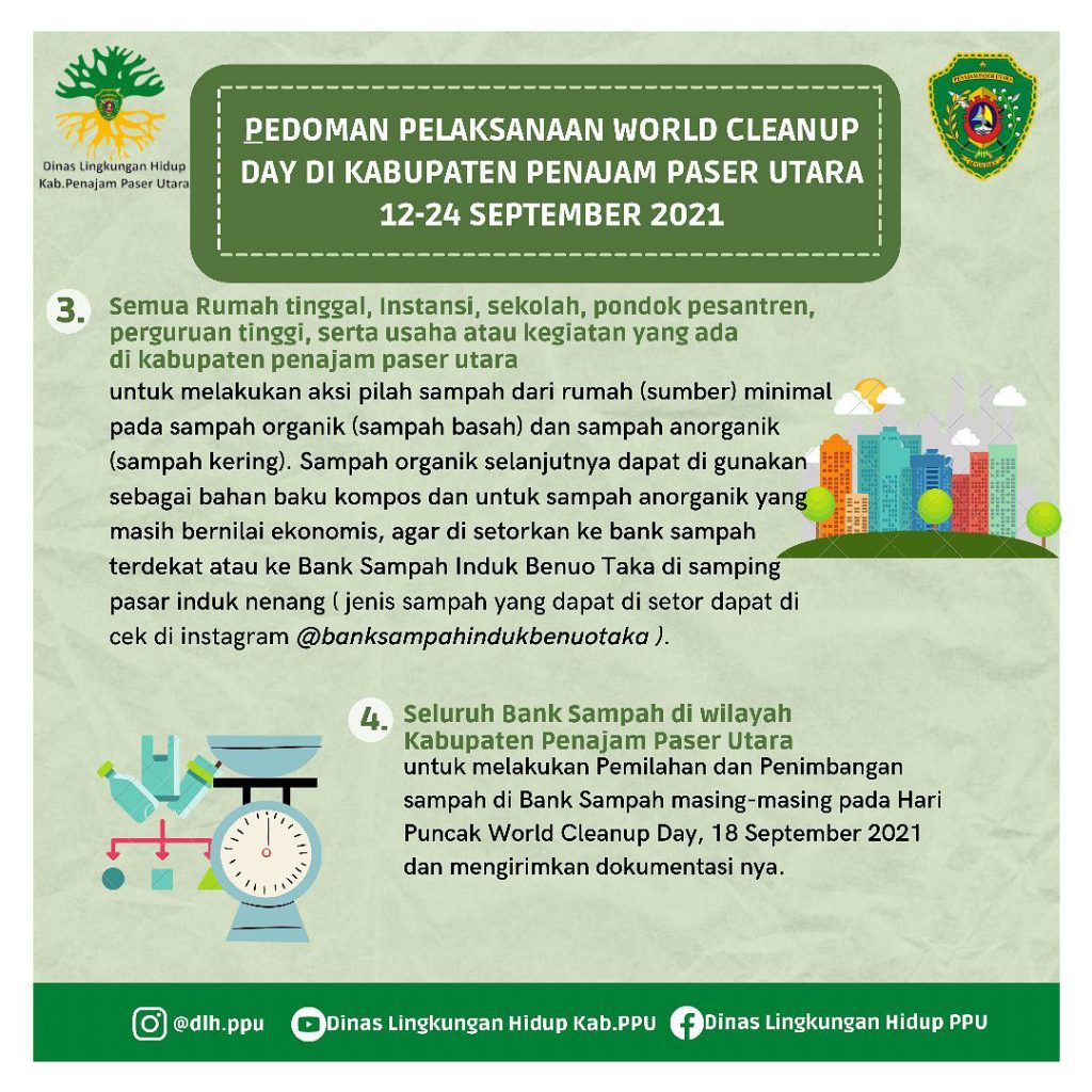 Berdasarkan Surat Edaran Sekretaris Daerah Nomor: 660.2/1123/TU-PIM/392/DLH , berikut panduan pelaksanaan World Cleanup Day 2021 di Kabupaten Penajam Paser Utara.