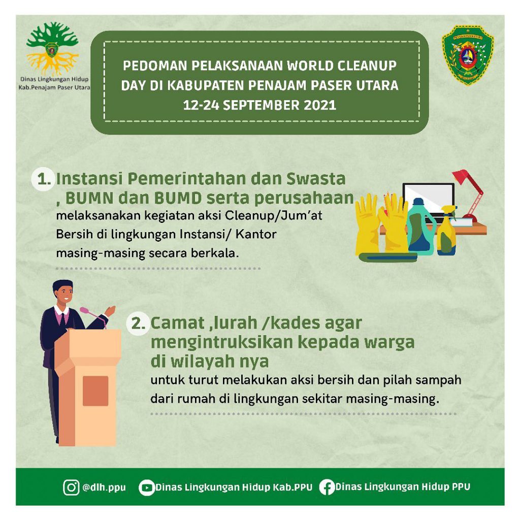 Berdasarkan Surat Edaran Sekretaris Daerah Nomor: 660.2/1123/TU-PIM/392/DLH , berikut panduan pelaksanaan World Cleanup Day 2021 di Kabupaten Penajam Paser Utara.