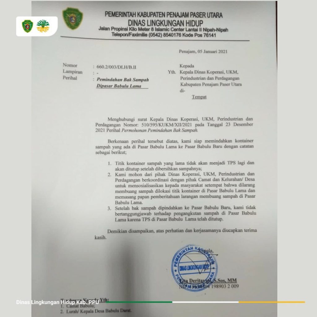 Pemindahan ini berdasarkan permohonan pemindahan Bak Sampah/TPS dari Pasar Babulu Lama ke Pasar Babulu Baru oleh Dinas Koperasi, UKM, Perindustrian dan Perdagangan nomor: 510/595/KUKM/XII/2021.