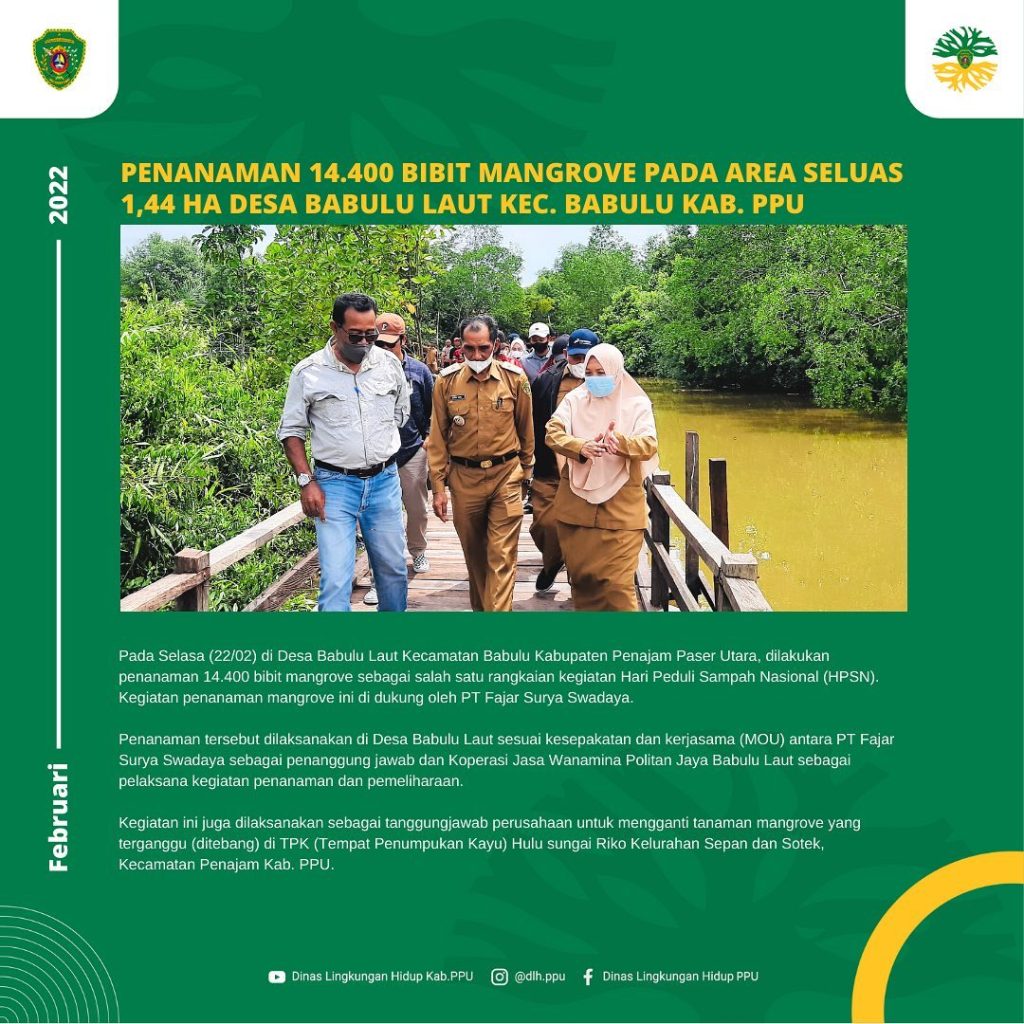 Pada Selasa (22/02) di Desa Babulu Laut Kecamatan Babulu Kabupaten Penajam Paser Utara, dilakukan penanaman 14.400 bibit mangrove sebagai salah satu rangkaian kegiatan Hari Peduli Sampah Nasional (HPSN). Kegiatan penanaman mangrove ini di dukung oleh PT Fajar Surya Swadaya.