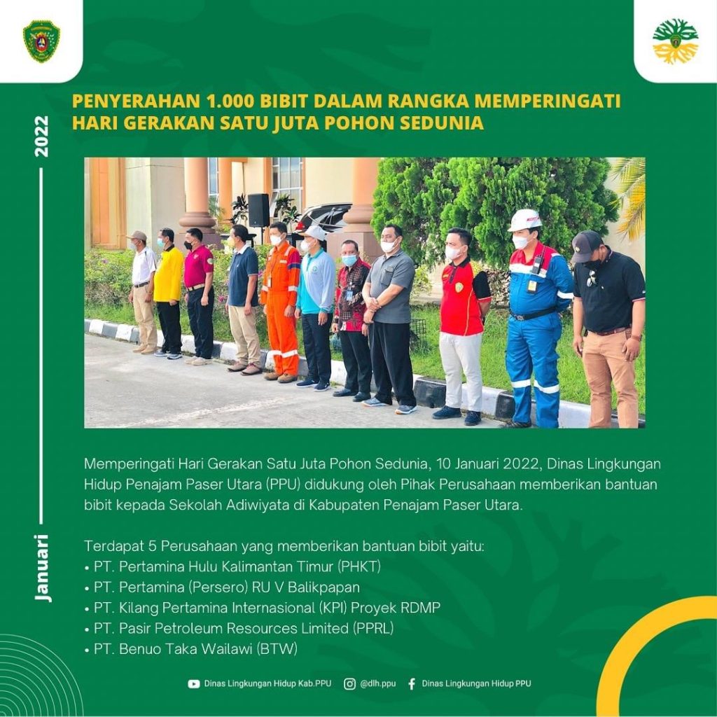 Memperingati Hari Gerakan Satu Juta Pohon Sedunia, 10 Januari 2022, Dinas Lingkungan Hidup Penajam Paser Utara (PPU) didukung oleh Pihak Perusahaan memberikan bantuan bibit kepada Sekolah Adiwiyata di Kabupaten Penajam Paser Utara.