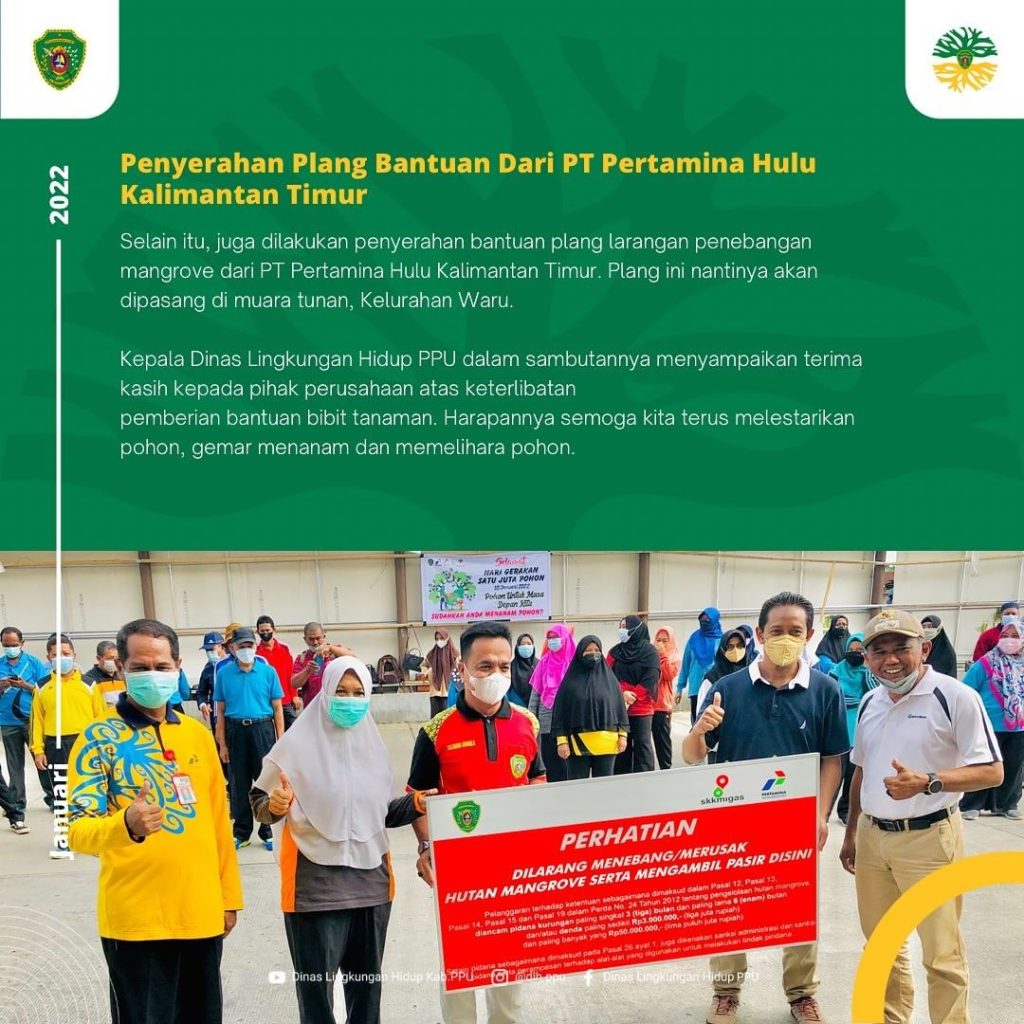Selain itu, juga dilakukan penyerahan bantuan plang larangan penebangan mangrove dari PT Pertamina Hulu Kalimantan Timur. Plang ini nantinya akan dipasang di muara tunan, Kelurahan Waru.