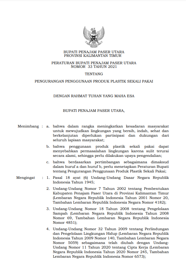 Dinas Lingkungan Hidup menyusun Peraturan Bupati Penajam Paser Utara No. 33 Tahun 2021 Tentang Pengurangan Penggunaan Produk Plastik Sekali Pakai