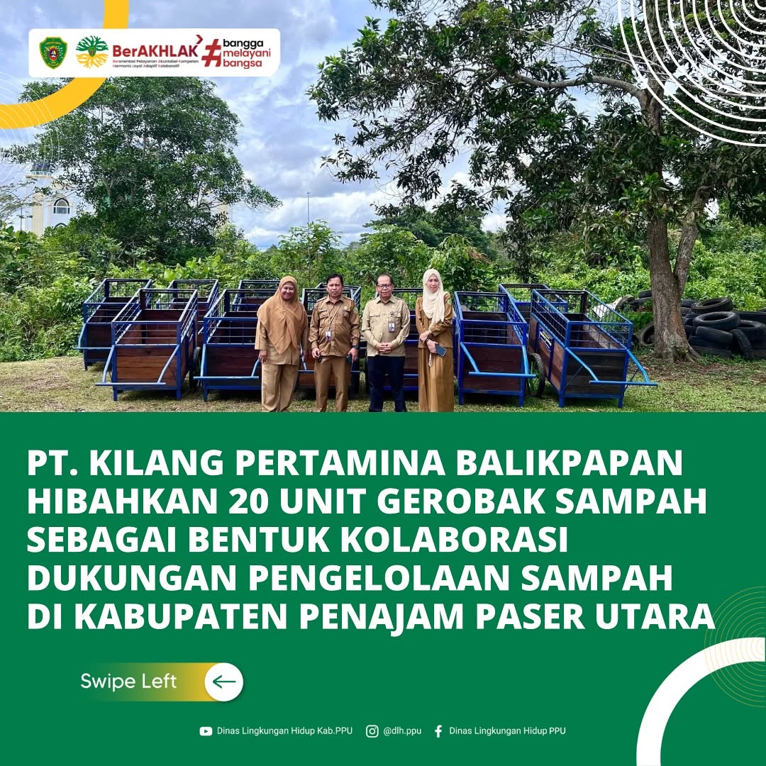 Dinas Lingkungan Hidup Kab.PPU mengucapkan terima kasih kepada PT. Kilang Pertamina Balikpapan yang telah berkontribusi menghibahkan 20 Unit Gerobak Sampah sebagai bentuk kolaborasi dukungan Pengelolaan sampah di Kabupaten Penajam Paser Utara.