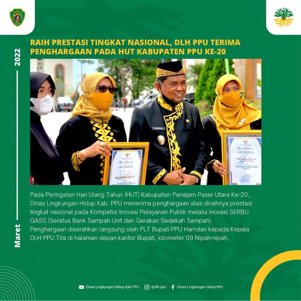 Pada Peringatan Hari Ulang Tahun (HUT) Kabupaten Penajam Paser Utara Ke-20, Dinas Lingkungan Hidup Kab. PPU menerima penghargaan atas diraihnya prestasi tingkat nasional pada Kompetisi Inovasi Pelayanan Publik melalui inovasi SERBU GASS (Seratus Bank Sampah Unit dan Gerakan Sedekah Sampah).
