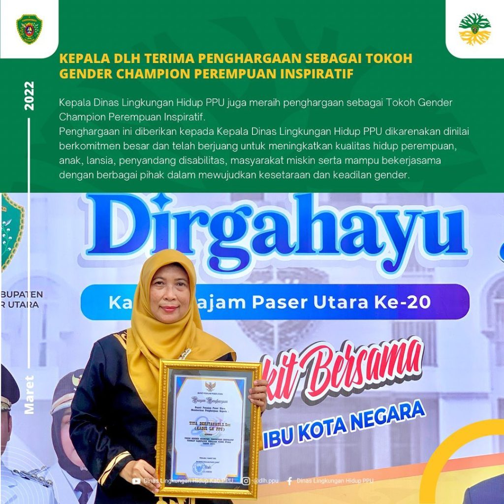 Penghargaan ini diberikan kepada Kepala Dinas Lingkungan Hidup PPU dikarenakan dinilai berkomitmen besar dan telah berjuang untuk meningkatkan kualitas hidup perempuan, anak, lansia, penyandang disabilitas, masyarakat miskin serta mampu bekerjasama dengan berbagai pihak dalam mewujudkan kesetaraan dan keadilan gender.