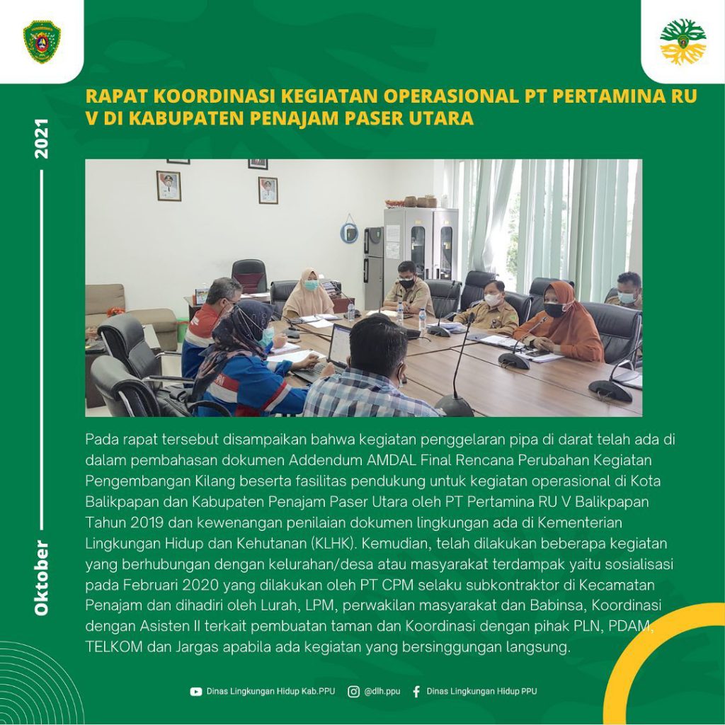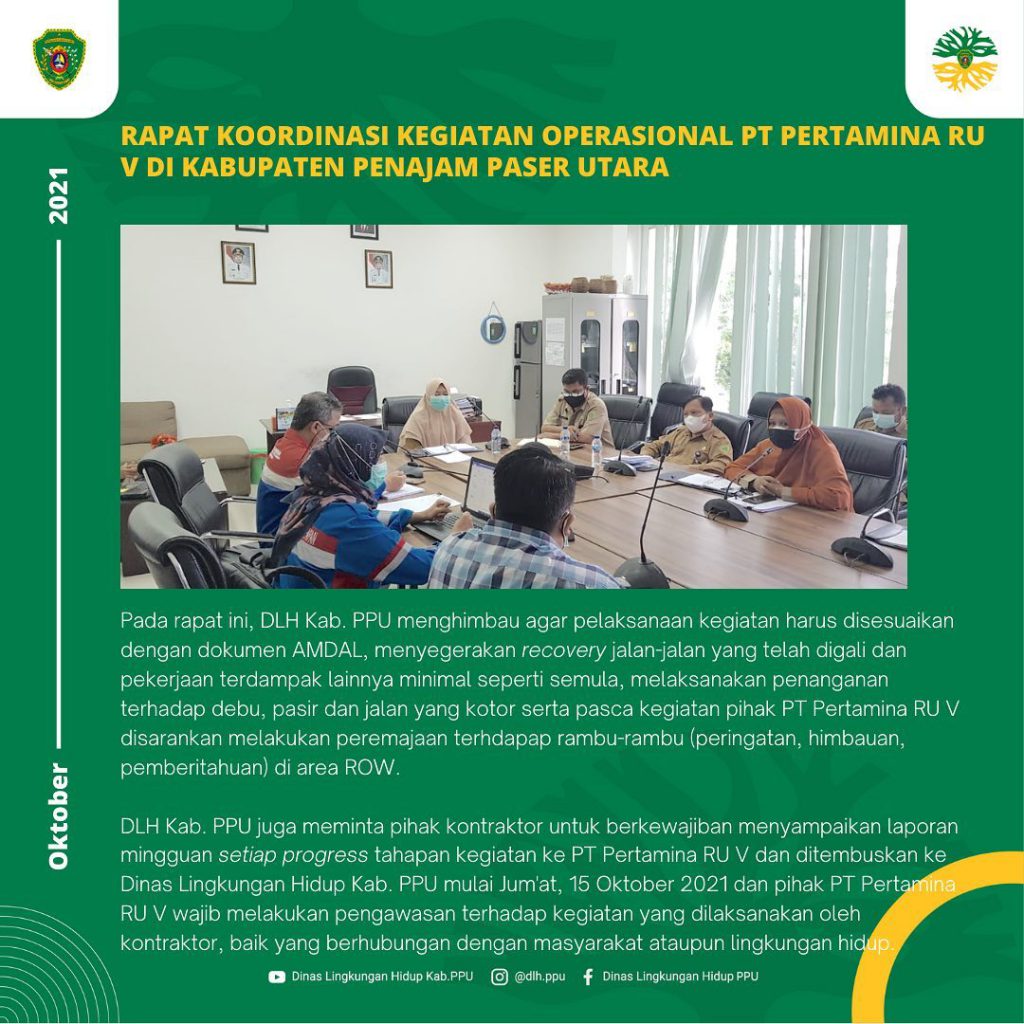 Pada rapat ini, DLH Kab. PPU menghimbau agar pelaksanaan kegiatan harus disesuaikan dengan dokumen AMDAL, menyegerakan recovery jalan-jalan yang telah digali dan pekerjaan terdampak lainnya minimal seperti semula, melaksanakan penanganan terhadap debu, pasir dan jalan yang kotor serta pasca kegiatan pihak PT Pertamina RU V disarankan melakukan peremajaan terhdapap rambu-rambu (peringatan, himbauan, pemberitahuan) di area ROW.