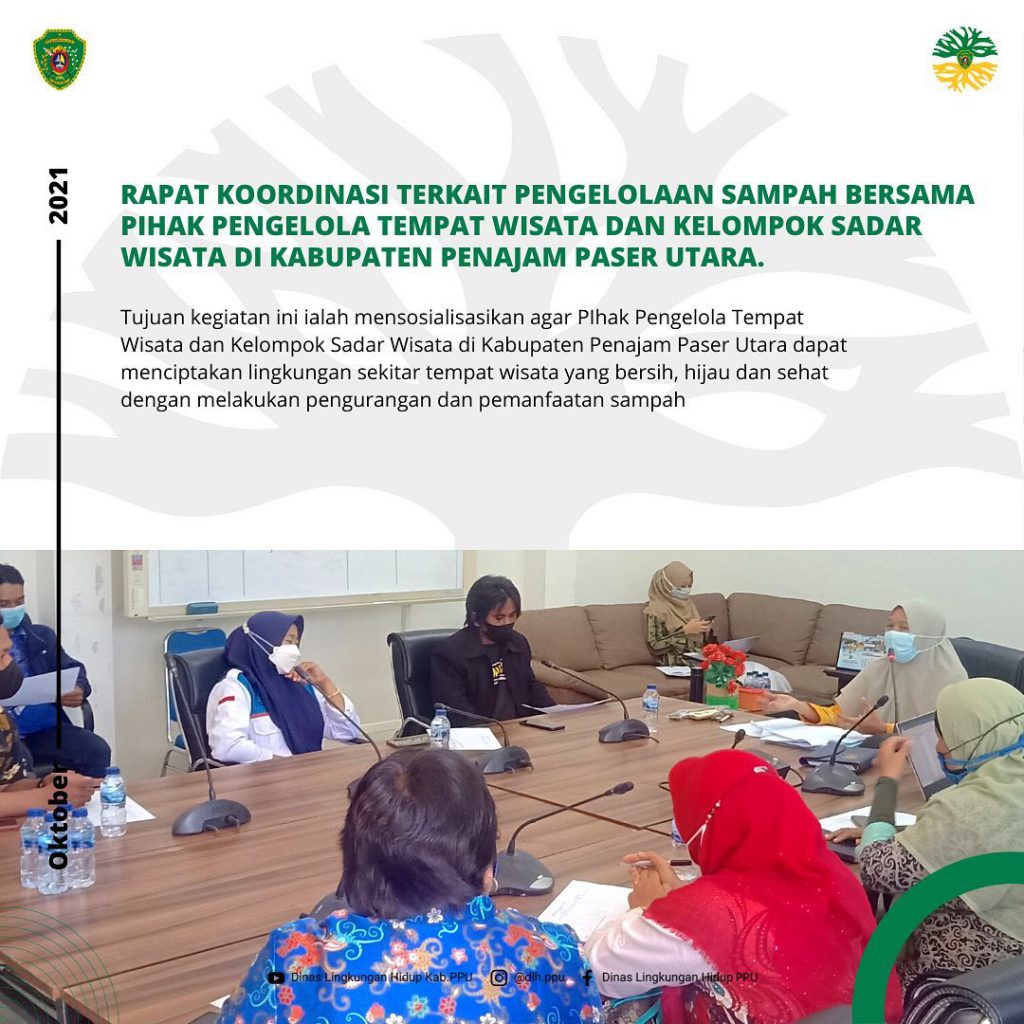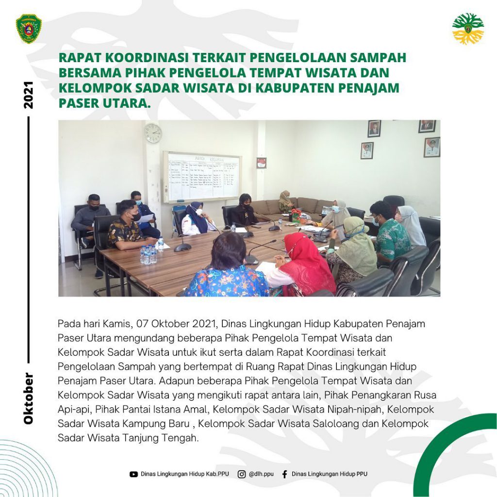 Pada hari Kamis, 07 Oktober 2021, Dinas Lingkungan Hidup Kabupaten Penajam Paser Utara mengundang beberapa Pihak Pengelola Tempat Wisata dan Kelompok Sadar Wisata untuk ikut serta dalam Rapat Koordinasi terkait Pengelolaan Sampah yang bertempat di Ruang Rapat Dinas Lingkungan Hidup Penajam Paser Utara. Adapun beberapa Pihak Pengelola Tempat Wisata dan Kelompok Sadar Wisata yang mengikuti rapat antara lain, Pihak Penangkaran Rusa Api-api, Pihak Pantai Istana Amal, Kelompok Sadar Wisata Nipah-nipah, Kelompok Sadar Wisata Kampung Baru , Kelompok Sadar Wisata Saloloang dan Kelompok Sadar Wisata Tanjung Tengah.