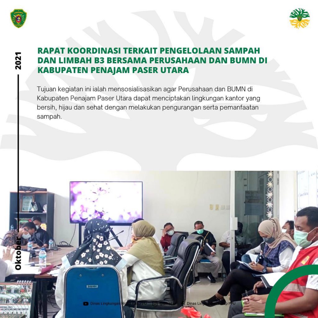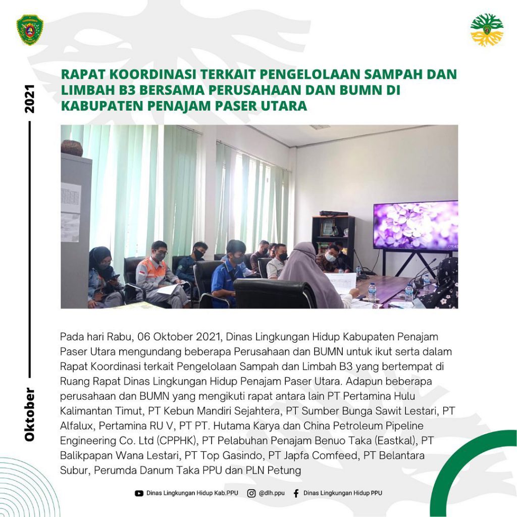 Pada hari Rabu, 06 Oktober 2021, Dinas Lingkungan Hidup Kabupaten Penajam Paser Utara mengundang beberapa Perusahaan dan BUMN untuk ikut serta dalam rapat koordinasi terkait Pengelolaan Sampah dan Limbah B3 yang bertempat di Ruang Rapat Dinas Lingkungan Hidup Penajam Paser Utara. Adapun beberapa perusahaan dan BUMN yang mengikuti rapat antara lain PT Pertamina Hulu Kalimantan Timut, PT Kebun Mandiri Sejahtera, PT Sumber Bunga Sawit Lestari, PT Alfalux, Pertamina RU V, PT PT. Hutama Karya dan China Petroleum Pipeline Engineering Co. Ltd (CPPHK), PT Pelabuhan Penajam Benuo Taka (Eastkal), PT Balikpapan Wana Lestari, PT Top Gasindo, PT Japfa Comfeed, PT Belantara Subur, Perumda Danum Taka PPU dan PLN Petung.
