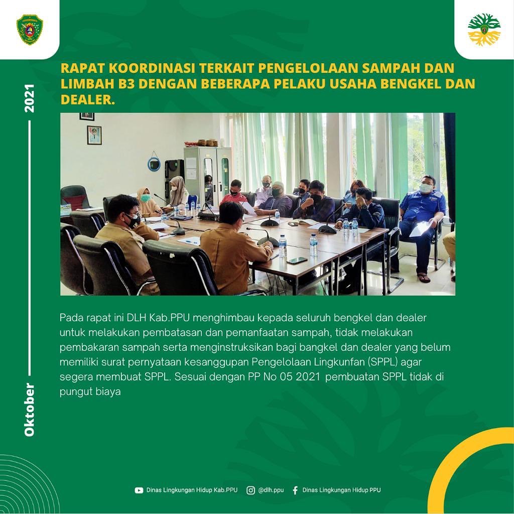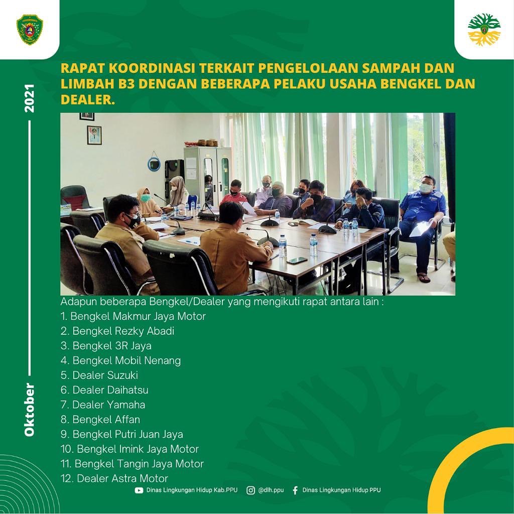 Pada hari Senin tanggal 12 Oktober 2021, Dinas Lingkungan Hidup Penajam Paser Utara mengundang beberapa pelaku usaha seperti Bengkel dan Dealer yang ada di Kabupaten Penajam Paser Utara untuk ikut serta dalam rapat koordinasi terkait Pengelolaan Sampah dan Limbah B3 yang bertempat di Ruang Rapat Dinas Lingkungan Hidup Penajam Paser Utara.