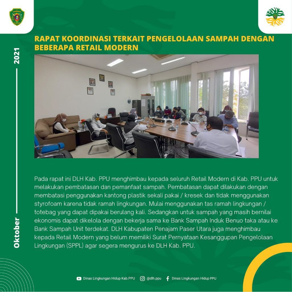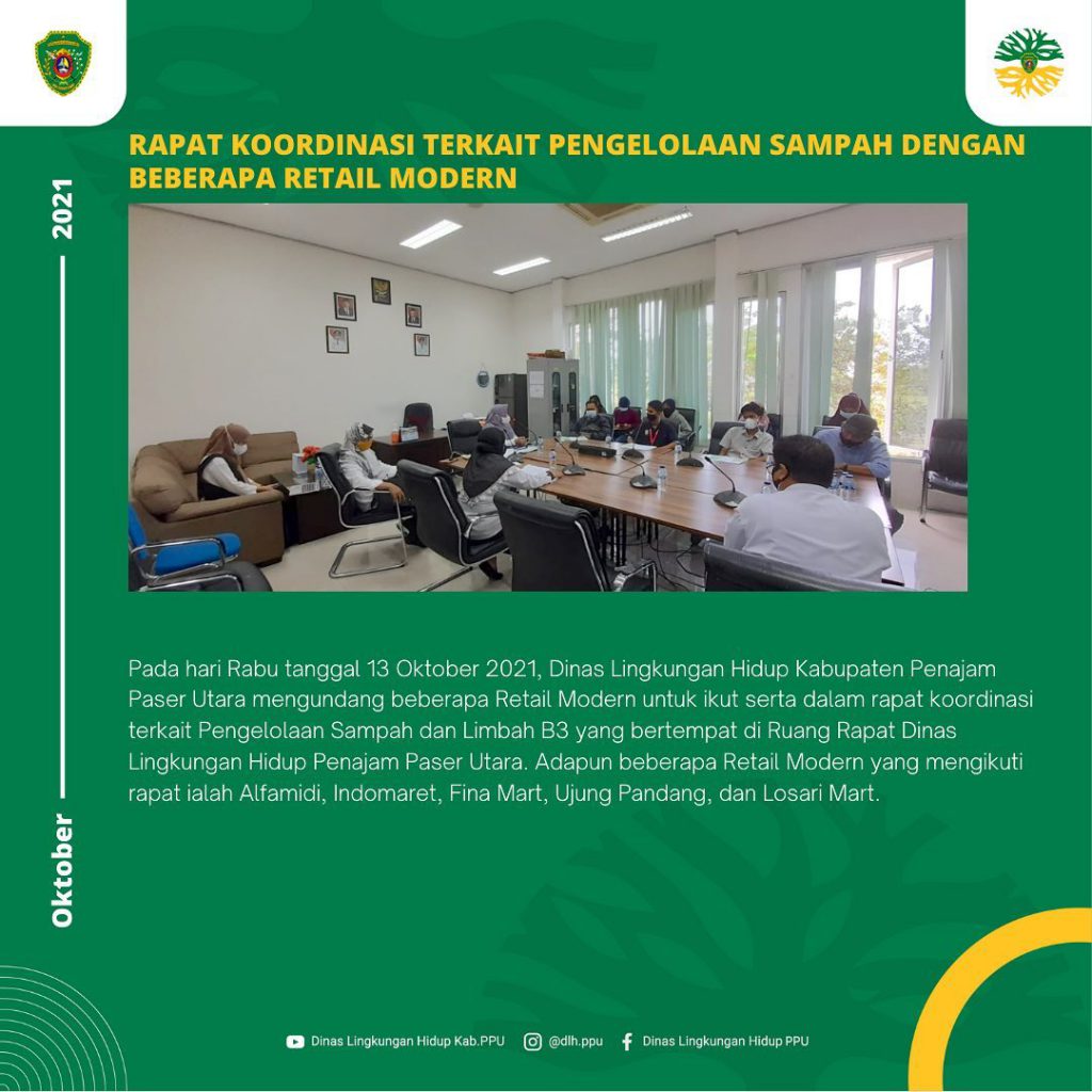 Pada hari Rabu tanggal 13 Oktober 2021, Dinas Lingkungan Hidup Kabupaten Penajam Paser Utara mengundang beberapa Retail Modern untuk ikut serta dalam rapat koordinasi terkait Pengelolaan Sampah dan Limbah B3 yang bertempat di Ruang Rapat Dinas Lingkungan Hidup Penajam Paser Utara. Adapun beberapa Retail Modern yang mengikuti rapat ialah Alfamidi, Indomaret, Fina Mart, Ujung Pandang, dan Losari Mart.