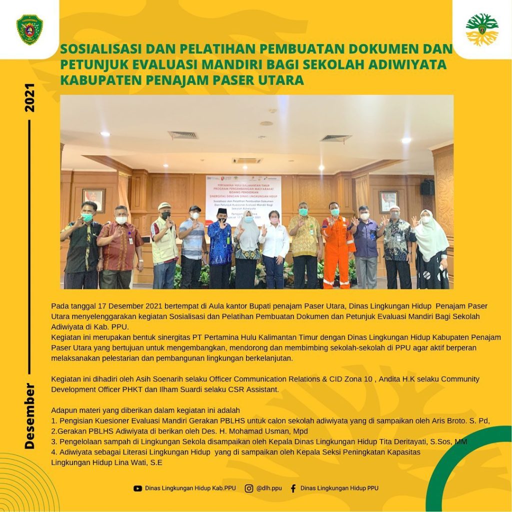 Kegiatan ini merupakan bentuk sinergitas PT Pertamina Hulu Kalimantan Timur (PHKT) dengan Dinas Lingkungan Hidup Kabupaten Penajam Paser Utara yang bertujuan untuk mengembangkan, mendorong dan membimbing sekolah-sekolah di PPU agar aktif berperan melaksanakan pelestarian dan pembangunan lingkungan berkelanjutan.